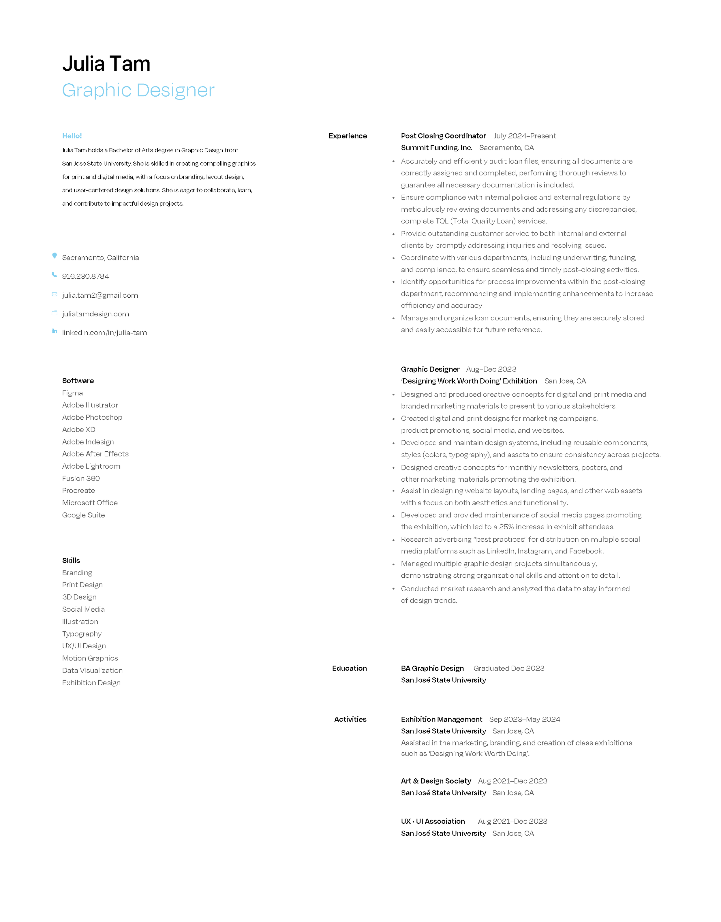 Julia Tam holds a Bachelor of Arts degree in Graphic Design from San Jose State University. She is skilled in creating compelling graphics for print and digital media, with a focus on branding, layout design, and user-centered design solutions. She is eager to collaborate, learn, and contribute to impactful design projects.